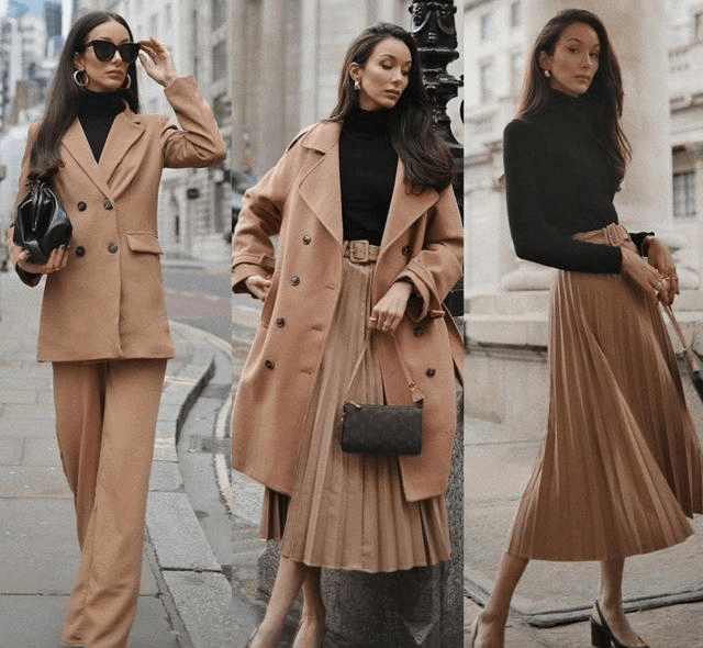 一身驼色的西装套装,版型挺括的西装表衣,和可能完好装饰腿型的西装阔腿裤,彰显着职场女性的精简精干。内搭的玄色毛衣和一双玄色尖头高跟鞋鞋遥相照应,简约大方又充满着些许气场。而一件驼色百褶裙和玄色毛衣的搭配,充满着大方女人的质感和高级,倘若思要更显得成熟肃穆,那么一件驼色的大衣就足够,还付与了一种大女人的气场,加倍的充满着特殊的女性魅力!
